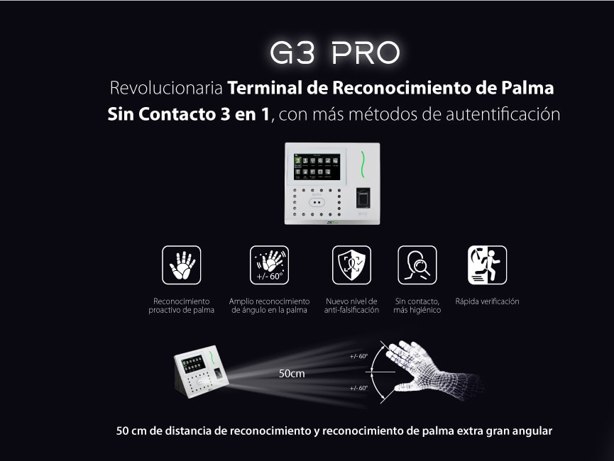 La revolucionaria terminal de reconocimiento de palma 3 en 1, cuenta con tecnología Computer Vision, la cuál le permite realizar la verificación de un individuo usando tres aspectos específicos de la palma.